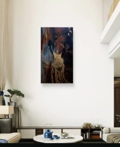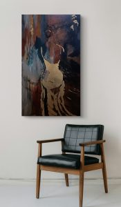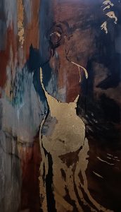 Obraz pt. ,, Złote cienie tajemnicy”, akryl, szlagmetal na płótnie, 70/120 cm, 2025 r, sygn.p.d: HCh 2025