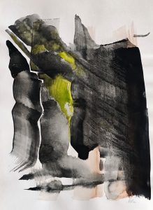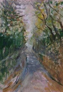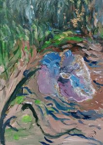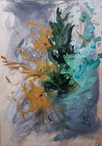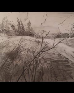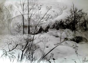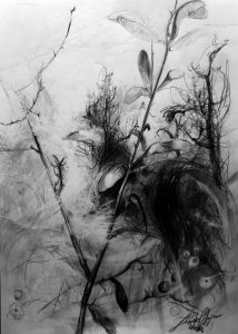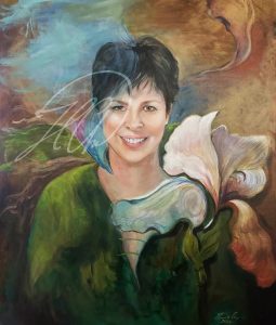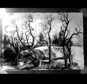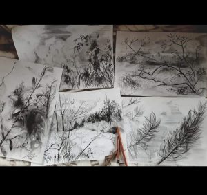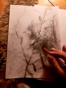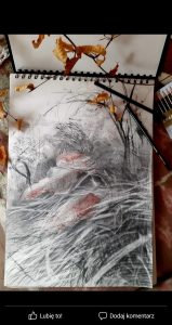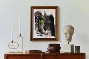 rysunek Stylish composition of artist workspace room with design retro teak commode, mock up poster frame, book, decoration and elegant accessories. Template. portret